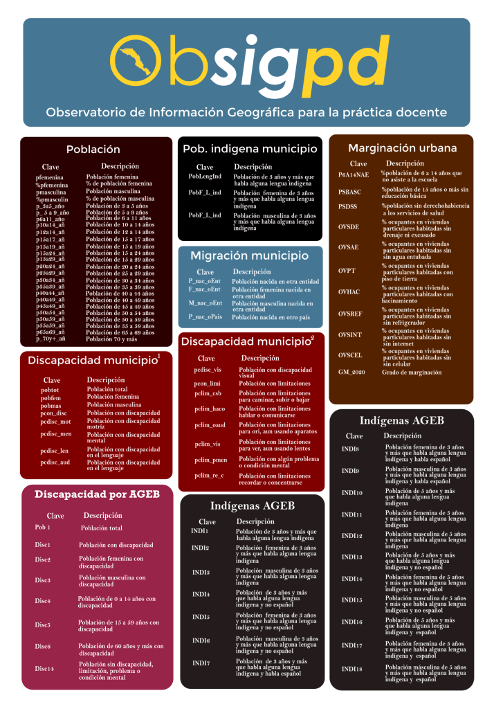 Logramos gestionar y organizar en este mapa, información del Instituto Nacional de Estadística, Geografía e Informática (INEGI); el Consejo Nacional de Población (CONAPO); el Centro Investigaciones y Estudios Superiores en Antropología Social (CIESAS) y la Secretaría de educación Pública del estado de Baja California Sur. La mayor parte de estos datos, son del último censo de población y vivienda 2020. Es importante que si no estas familiarizado con la nomenclatura de INEGI, descargues el siguiente directorio dando un click a la imagen: